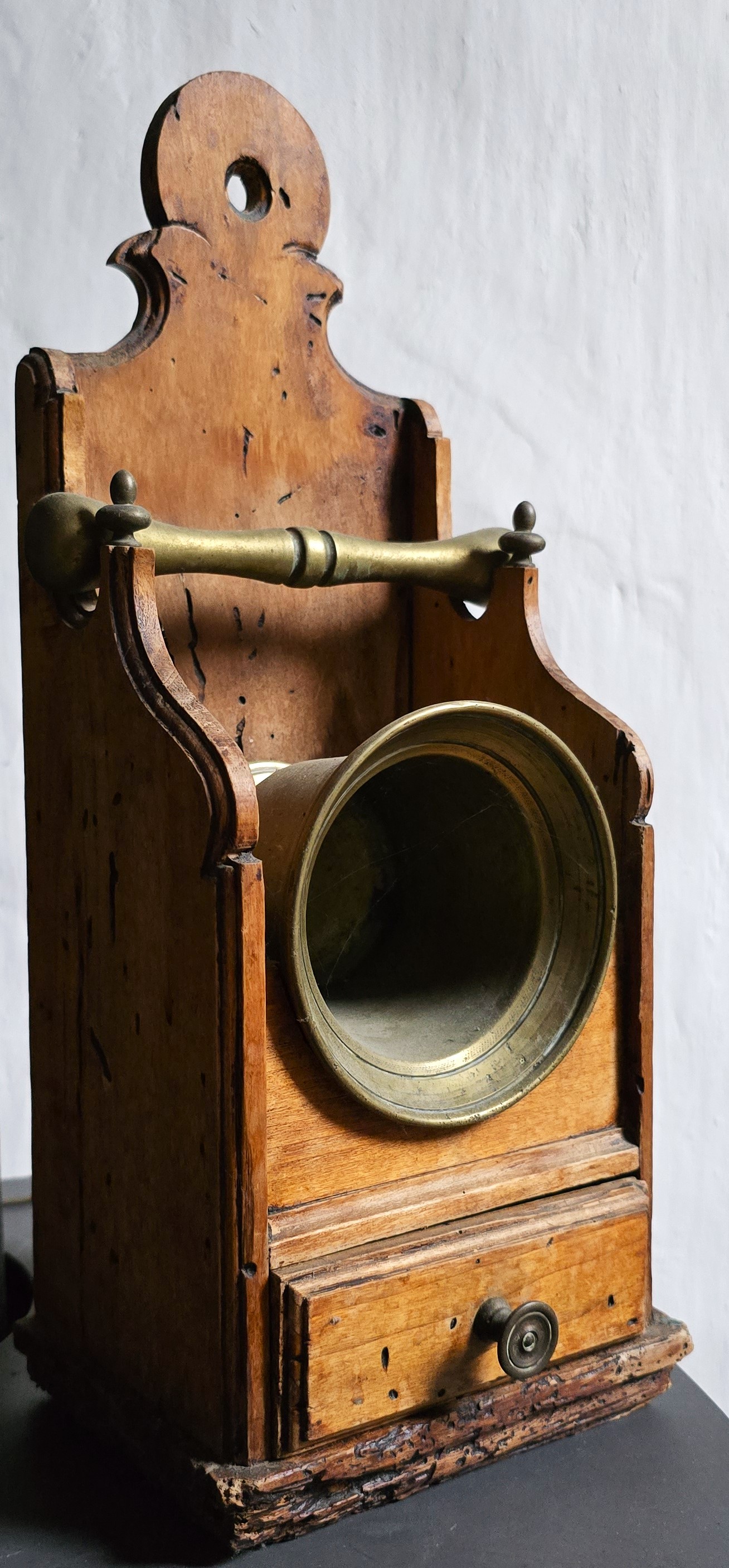 Gegoten ronde bronzen apothekers vijzel, verbreedt zich naar boven toe. Twee geprofileerde ribben. Originele stamper en houten hang rekje met lade. Midden 18e eeuw. Tegen het einde van de 18e eeuw werden ze geleidelijk