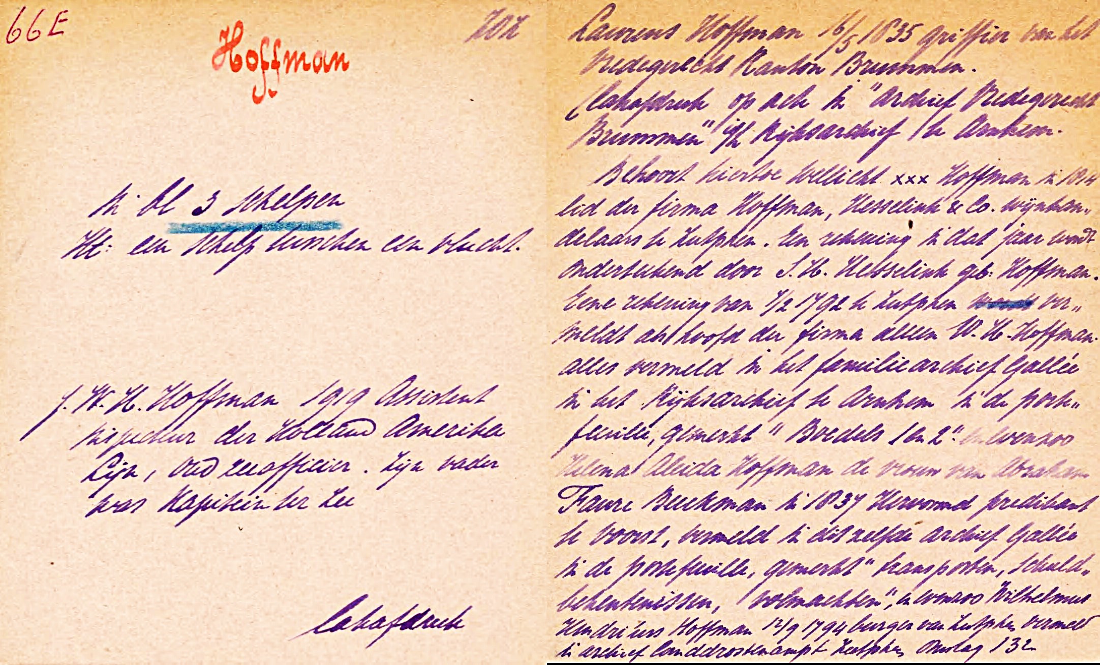 Wat deze drie families rond de jaren 2000 samen bracht was Mattheus Hoffman (1709-1792) conrector van de Latijnse school in Emmerik gehuwd in Cleve met Johanna Henriette von Seets. Het zijn gezamenlijke stamvaders van alle deelnemers aan dit project. Het was een spannende en verrassende zoektocht. Iets later vonden we de ouders van Mattheus: Hermann Hoffman (~1680-~1745), Schulmeister in Hamborn gehuwd in Mülheim an der Ruhr met Gerdraut Luers. Hermann kwam als het ware uit de lucht vallen, er was geen spoor van hem te vinden. Duidelijk was wel dat hij aanzien hebben moest, anders gaan je kinderen niet naar de universiteit en trouwen ze allen op stand. Alle pogingen liepen op niets uit. Het bleef 25 jaar een raadsel. Recent vonden we in de Protokolle der reformierten Duisburger Klasse Trinn auß den Häfen “des Schulmeisters Mutter” en Heinrich auf dem Hofe (~1632-1712), beiden begraven in Mülheim an der Ruhr. In het Protocol zijn alle functies van Hermann beschreven: Schulmeister zu Hamborn Schmithorst, Schulverwalter und Verwalter des Schulvermögens (1702–1735); Erbpächter, Mitbelehnter (“Hand”) und Hofinhaber des Bremenkamphofs (1708–1746); Fiscusverwalter der Classis Duisburg Kirchspiel Hamborn und Verwalter der Weesenkasse (1712–1735) en treedt hierbij op in een bestuurlijke rol “nahmens het Kirchspiel Marxloh”; In 1735 wordt Hermann benoemd tot Waisenhausvorsteher in Kleve (1735–1746). Het is bijzonder dat we de hele levensweg van Hermann en de geschiedenis van de reformierte Klassikalschule Hamborn kunnen terugvinden in het Protocol. Het onderzoek na de recente vondst van de Protokolle der reformierten Duisburger Klasse im 17. und 18. Jahrhundert, het boek van Franz Rommel met de titel Schulte-Marxloh. Hofes- und Familiengeschichte, Von der Agrar- zur Industrielandschaft im Raume zwischen Rhein, Ruhr und Lippe en de Mülheimer Stammfolgen III (1610-1806) is aanleiding de verdere afstamming te zoeken in het geslacht Hoffmann genaamd “Op Dem Hoff”, “Auf Dem Hofe”, “aus den Häfen”, “Op Ten Hove”, “Von Den Hoff” van het landgoed Hoffmannshof in Hamborn. De stamvader van deze familie is Arnt op ten Hove (~1444-~1480), Hoffmannshof, Kirchspiel Hamborn. Genannt: Herbst 1464 in der Walsumer Markliste als Hofesbesitzer des Hoffmannshofes "Croenenhoff opten Haeffe". Zie de genealogie van Hanns-Christian HOFIUS: Arnt Opten Hove Er zijn een aantal aanwijzingen die deze afstamming ondersteunen: De naamgeving van beide ouders van Hermann, Hermann's sociale plaats in de maatschappij, de vererving van vermogen en de functies van Hermann. De huwelijken van de kinderen van Hermann met bestuurlijke, patriciaat en adelijke families ondersteunen dit verder: Zijn dochter Magdalena Catharina huwde de familie Borghards van de Borgardshof die later de Hoffmanshof als Hofinhaber het bezit verkregen en bewoonden, zo heette de Hoffmannshof voortaan Borgardshof. Zijn dochter Anna Maria huwde 3 juni 1743 in Mülheim an der Ruhr met Willem Oesterwind. De familie Oesterwind komen we in 1849 weer tegen in de Officiële boeken van de heerschappij en Rentei Broich / Amt Broich-Styrum, nr. 1011 / 856 I–V: (V) Erfrechtzaak van het echtpaar Oesterwind in Saarn tegen de broers en zussen Hoffmann in Speldorf over de Hoffmannshof (met stamboom) (1849 – 1853). Het inzien van deze stamboom zal mogelijk verdere duidelijkheid scheppen. |